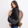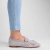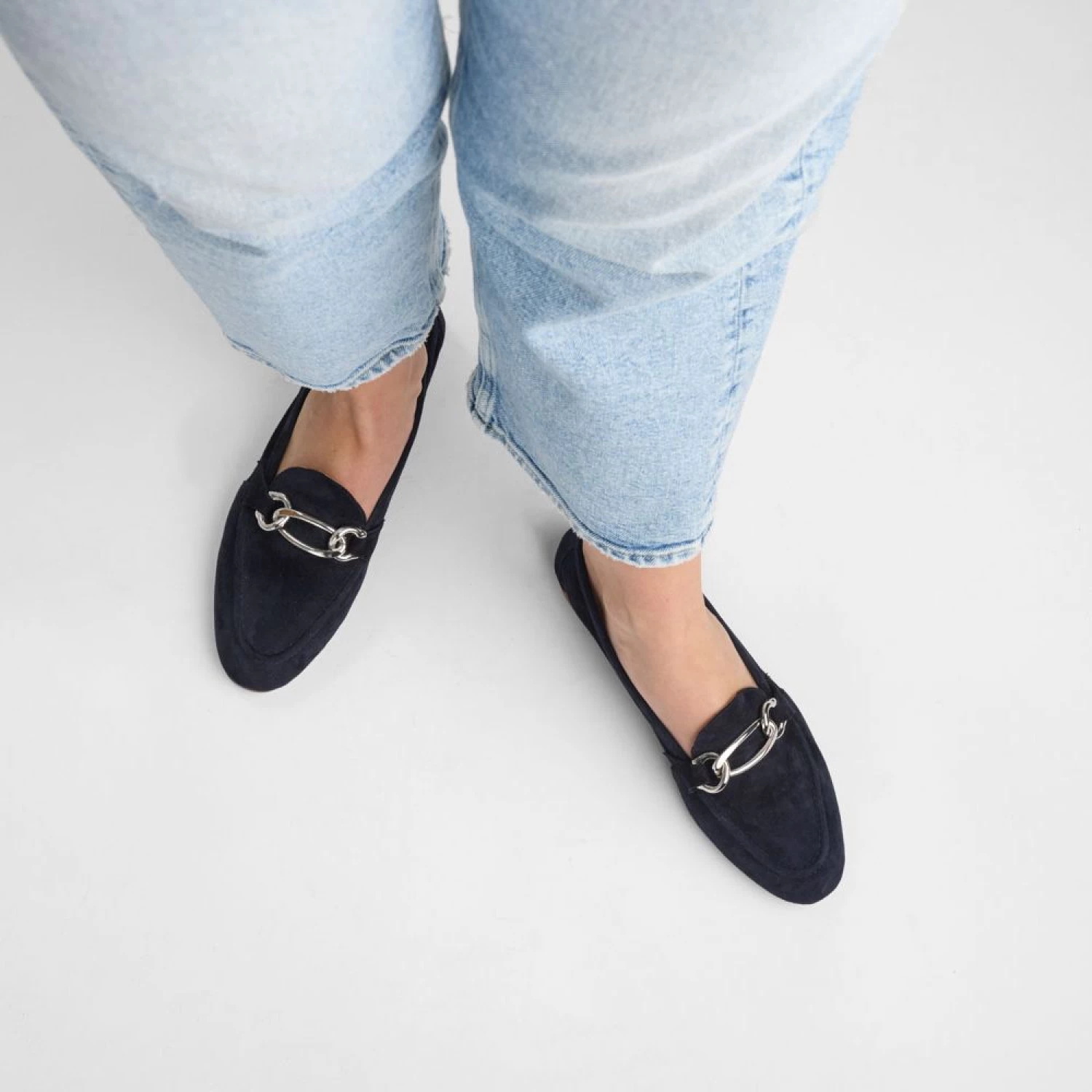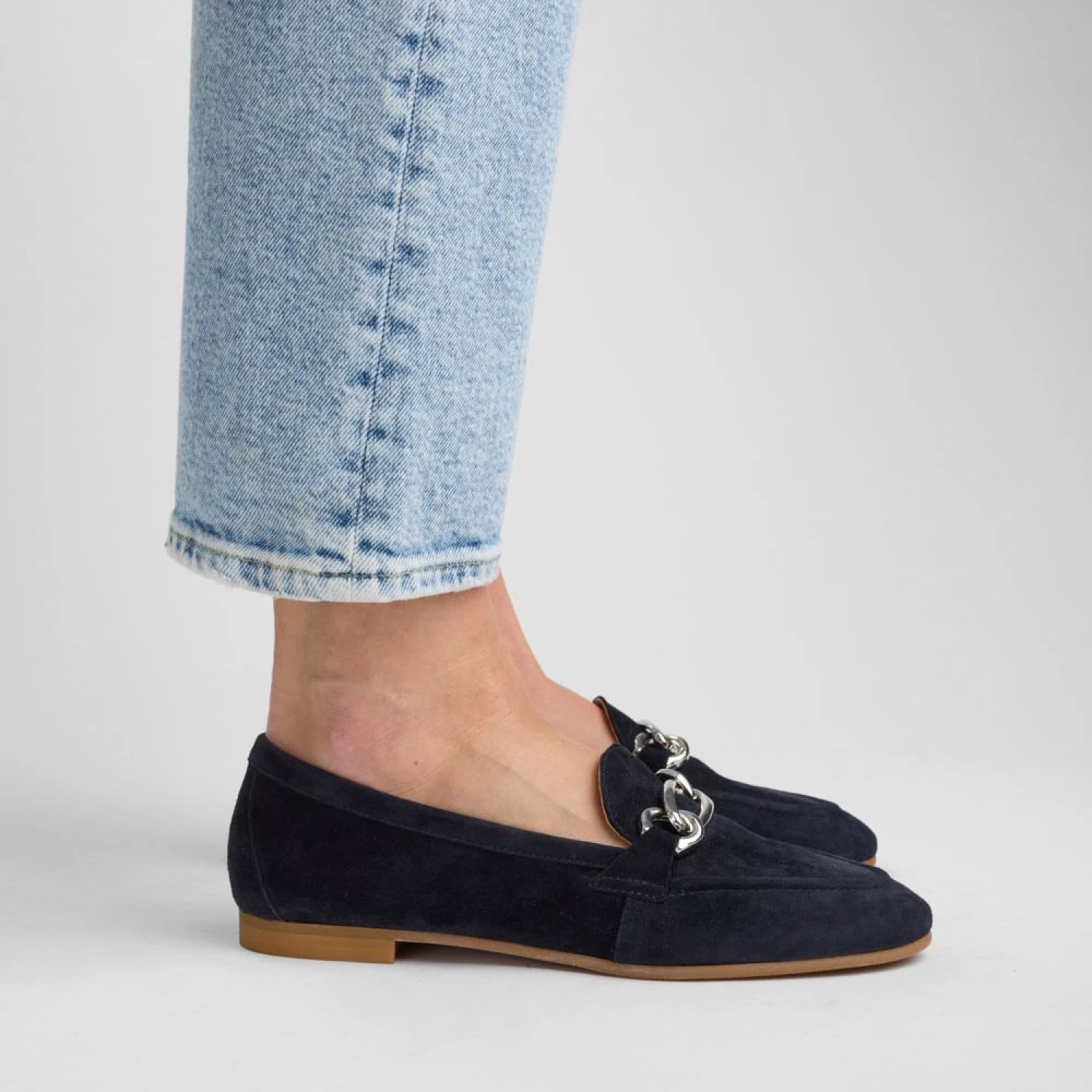 Mocassin pour femme en cuir velours marine souple, monté sur une forme allongée et ornée d’un morsetti argenté.
