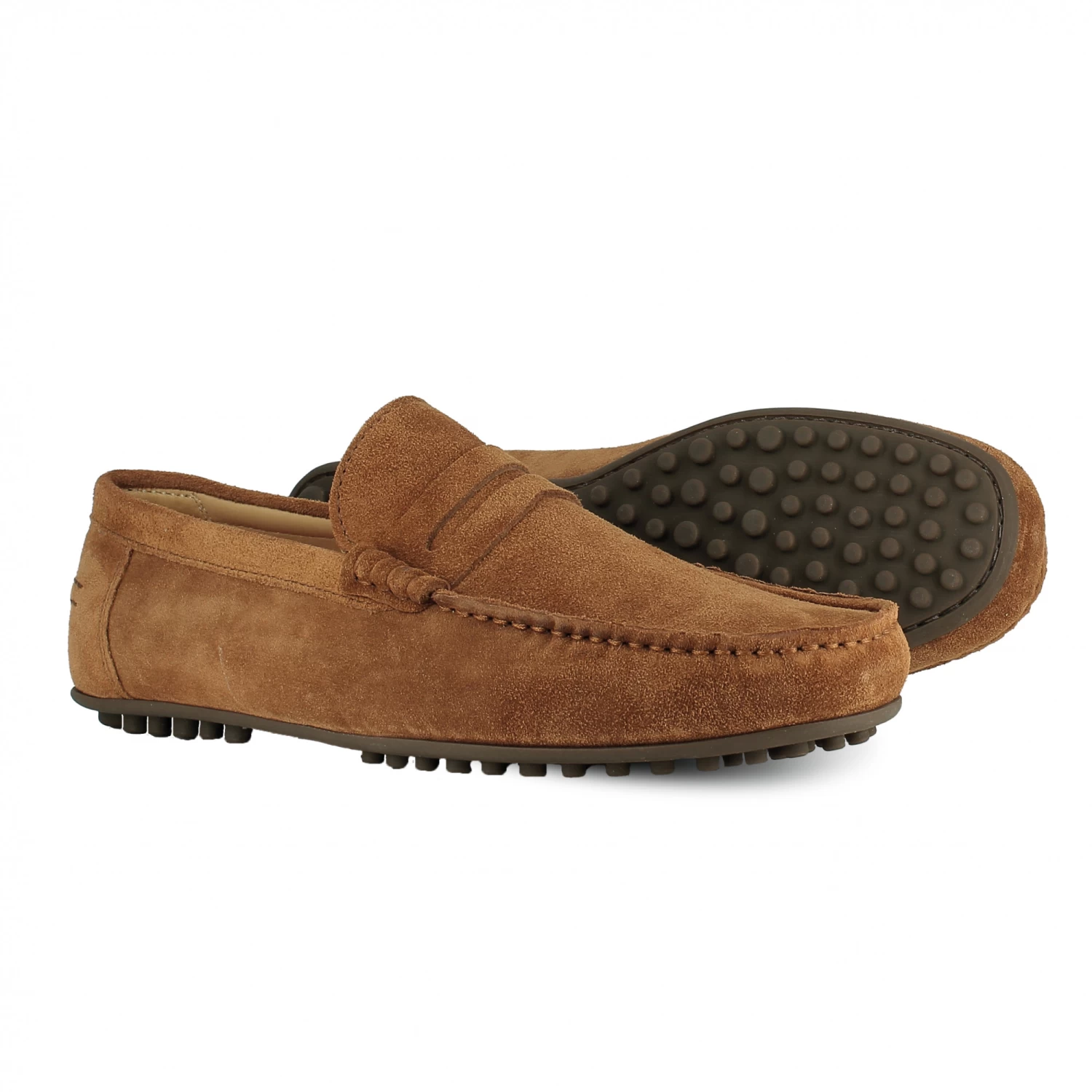 Mocassin Atlantic pour homme en cuir suédé tabac, montage cousu mocassin, semelle gomme à picots.