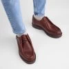 - Côté « chaire » de la trépointe contre la fleur de la tige, à l’extérieur du soulier avec la semelle intérieure. L’utilisation d’un fil de lin préalablement immergé dans de la poix chaude assure une étanchéité maximale. A cette étape, un garnissage en liège est ajouté, il assure étanchéité et confort en prenant l’empreinte du pied. La trépointe est cousue une seconde fois à l’extérieur de nouveau avec la tige et la semelle. Ce montage donne un look casual.