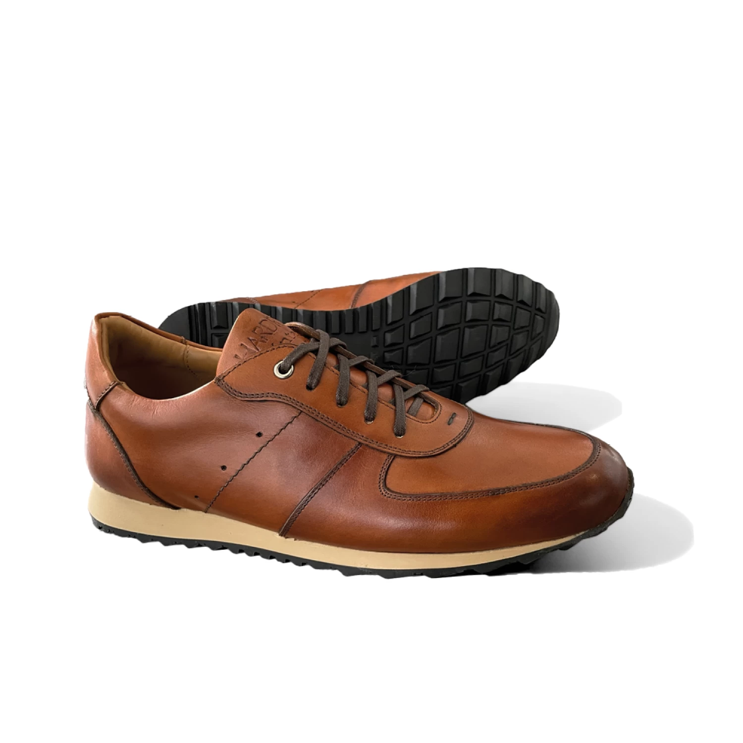 Sneakers Casper de type running, cuir lisse patiné gold. Montage Soudé.