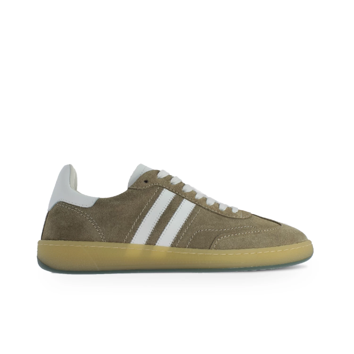 Sneakers pour homme Gazel Taupe, cuir suédé, cousu Bolognais, doublure intérieure cuir et éponge, semelle gomme marron, deux bandes sur le côté extérieur.