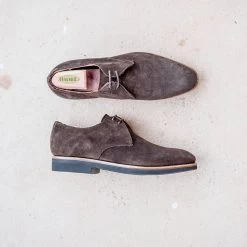 Le cuir hydro velours tanné en Allemagne est poncé côté chair, il est ensuite nourri à l’aide de graisse végétale assurant une résistance aux projections d’eau. Ce cuir est particulièrement résistant contrairement aux idées reçues.