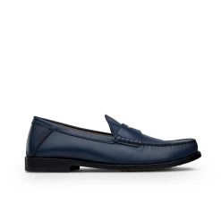 Mocassin Mae, Cuir lisse bleu, Montage cousu mocassin, Semelle cuir & patin gomme.