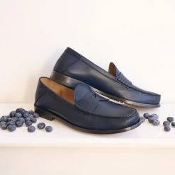 Mocassin Mae, Cuir lisse bleu, Montage cousu mocassin, Semelle cuir & patin gomme.