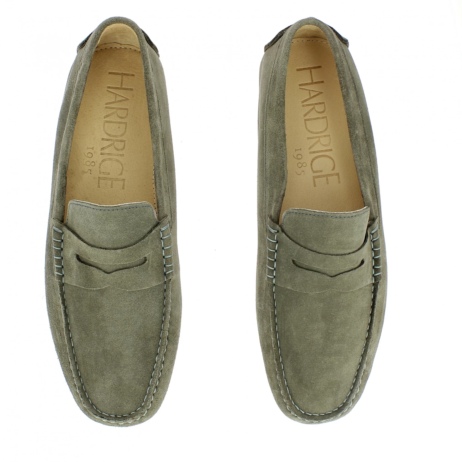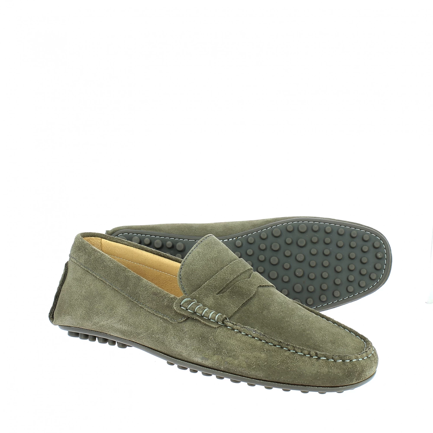 Mocassin homme en cuir et suede avec couture grise et semelle gomme à picots. Montage cousu main Mocassin.