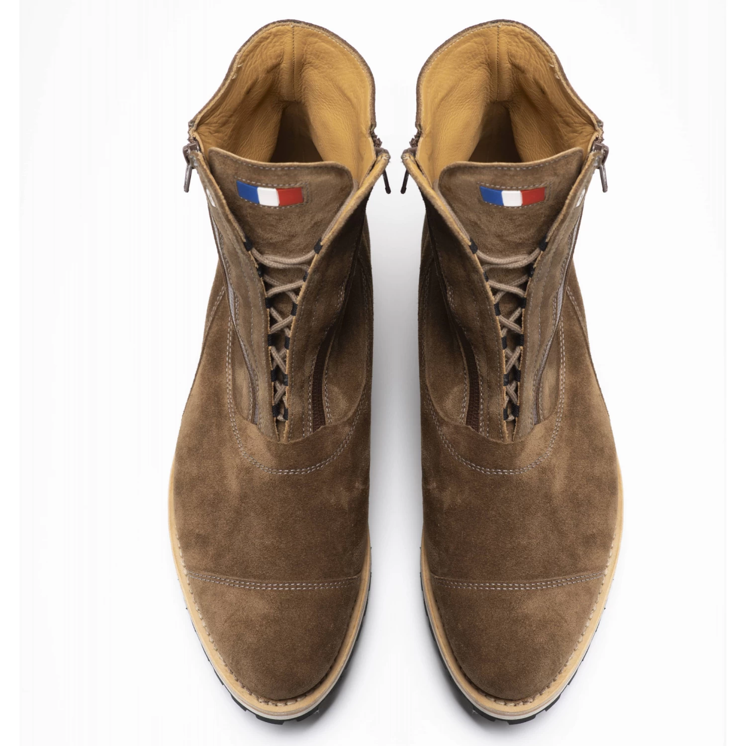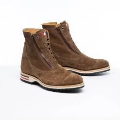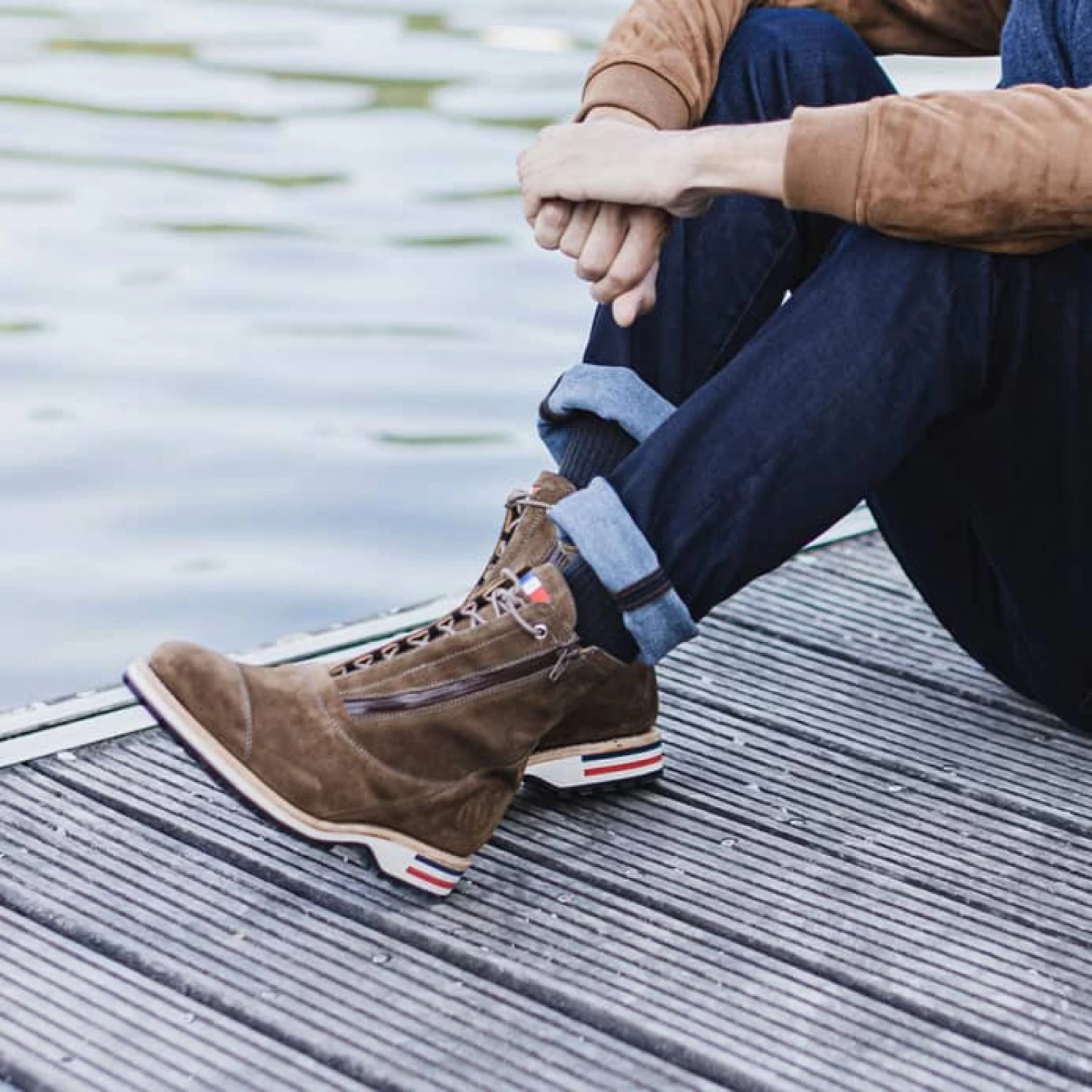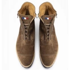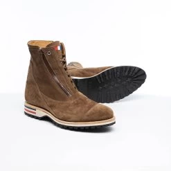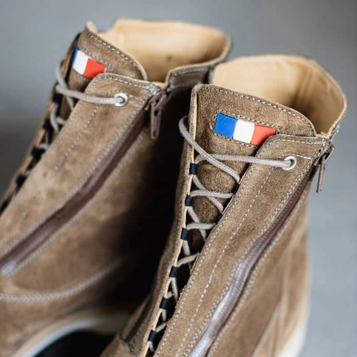 Le cuir hydro velours tanné en Allemagne est poncé côté chair, il est ensuite nourri à l’aide de graisse végétale assurant une résistance aux projections d’eau. Ce cuir est particulièrement résistant contrairement aux idées reçues.