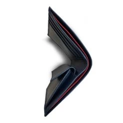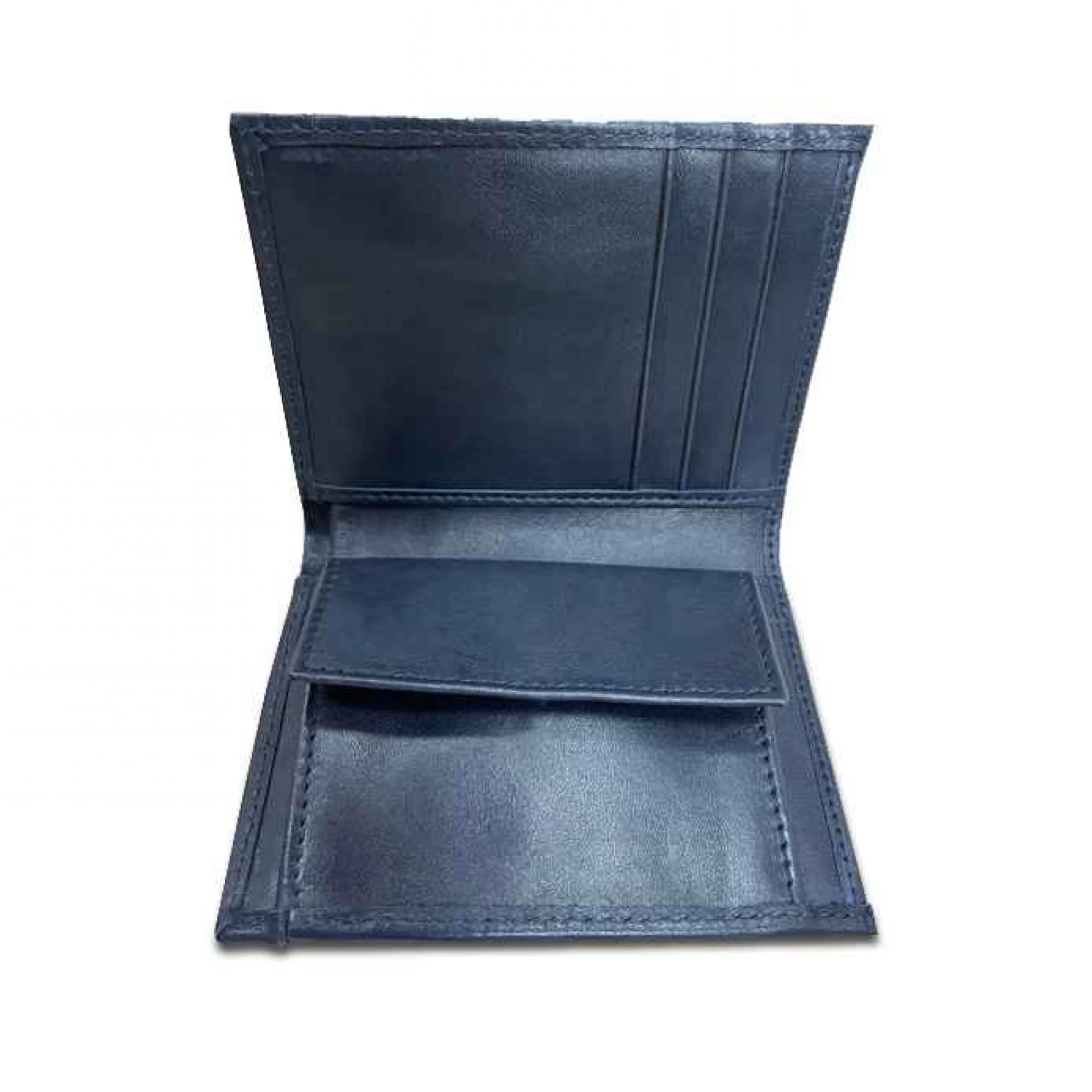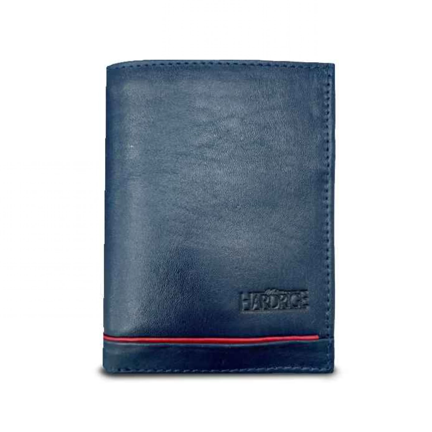 Portefeuille en cuir bleu premium composé de 2 volets. Compartiments pour cartes, pièces, billets. Présence de détails en cuir rouge et d’un marquage à chaud Maison Hardrige. Dimensions : 11,5*9 cm